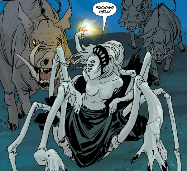 RP: Fiona is indeed touched by an angel, and I mean the hot one, not Della Reese. Is the rumor true that Fiona was a wee bit miffed when you killed off the creepily alluring spider assassin The Stalk?