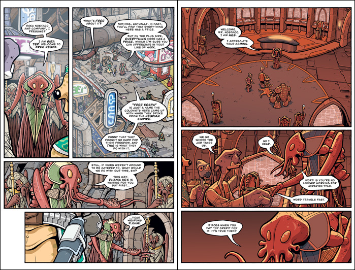 The graphic novel is also going to have a lot of special features, like an all-new 6-page story epilogue that was created exclusively for the book. I also have 10 pages of sketchbook concepts covering a lot of the aliens, costumes, and weapons that appear in the story. And there’s also a great pinup section with some amazing artists doing their take on the Runners characters, like David Petersen (Mouse Guard), Tim Seeley (Hack/Slash), Shawn McManus (Cinderella: From Fabletown with Love), and Khoi Pham (X-Men, Avengers).