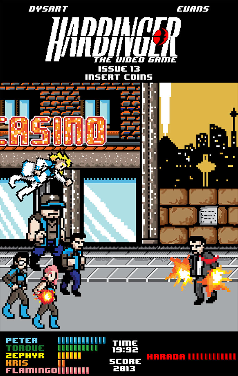 Here’s where I become a bit of a Hypocrite Douche for a second. I’ve railed for years against covers not having a Goddamn thing to do with the interior material. However, I’m giving Valiant a pass because these 16-bit video game homages stroke my nostalgia nads like no other. No, the material doesn’t take place in the late 80s or early 90s and no on plays video games. If I have to craft a loose defense, HARBINGER does fight Toyo Harada so in that sense the cover delivers on the material inside, but again I know that I’m reaching. I guess what I have a problem with is traditional covers that are all pose and no posse, wherein a splash page of ridiculous poses transplants original thought welcoming a reader. I know I’m old, but I found all of Valiant’s 16-bit month delightful and this was simply the icing on the HARBINGER WARS cake of goodness.